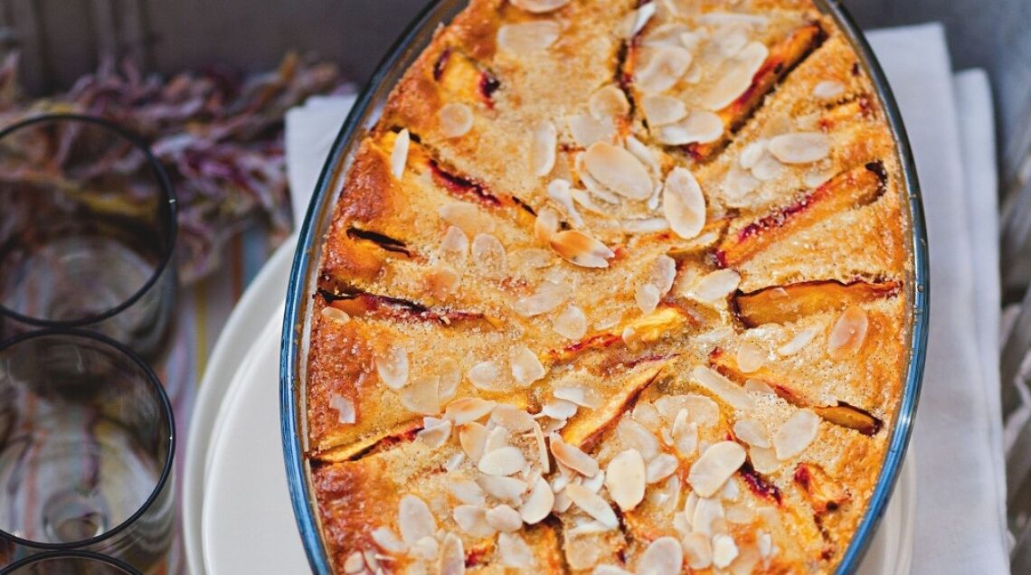 Il Clafoutis alle pesche segue la ricetta originale del dolce di origine francese che risale al XIX secolo, è preparato con le ciliegie e tradizionalmente è cotto in forno. Farina, mandorle, uova e zucchero sono arricchiti dalla panna, che rende la pastella più morbida, e dalla vaniglia che aggiunge profumo.