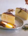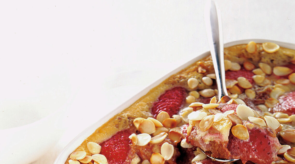 5) Cospargi con le fragole rimaste, metti in forno a 150° e cuoci per circa 50 minuti. Dopo aver sfornato il dolce, tosta leggermente in forno le lamelle di mandorle e distribuiscile sulla superficie. Servilo tiepido o freddo.