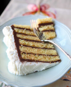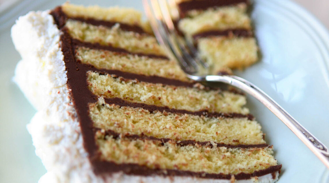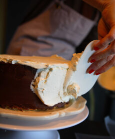 1) Sistema il primo disco di génoise sul piatto da portata e distribuiscici parte della ganache al cioccolato. Copri con il secondo disco e procedi allo stesso modo alternando uno strato di torta e uno di crema al cioccolato. Spalma i lati e la superficie della torta con la crema al cioccolato aromatizzata all’earl grey. Trasferisci il tutto in frigorifero e lascia rassodare la torta per un giorno.