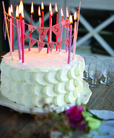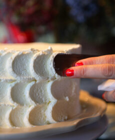 2) Monta la panna rimasta con il mascarpone e lo zucchero a velo. Distribuisci metà del composto cremoso sulla torta con una spatola. Trasferisci l’altra metà in una tasca da pasticcere con bocchetta liscia da 1 cm e spremi 3 ciuffetti uno sopra l’altro su un lato della torta. Appiattiscili con una spatola schiacciandoli leggermente verso destra. Procedi allo stesso modo qualche cm più in là e vai avanti fino a ricoprire interamente la torta.