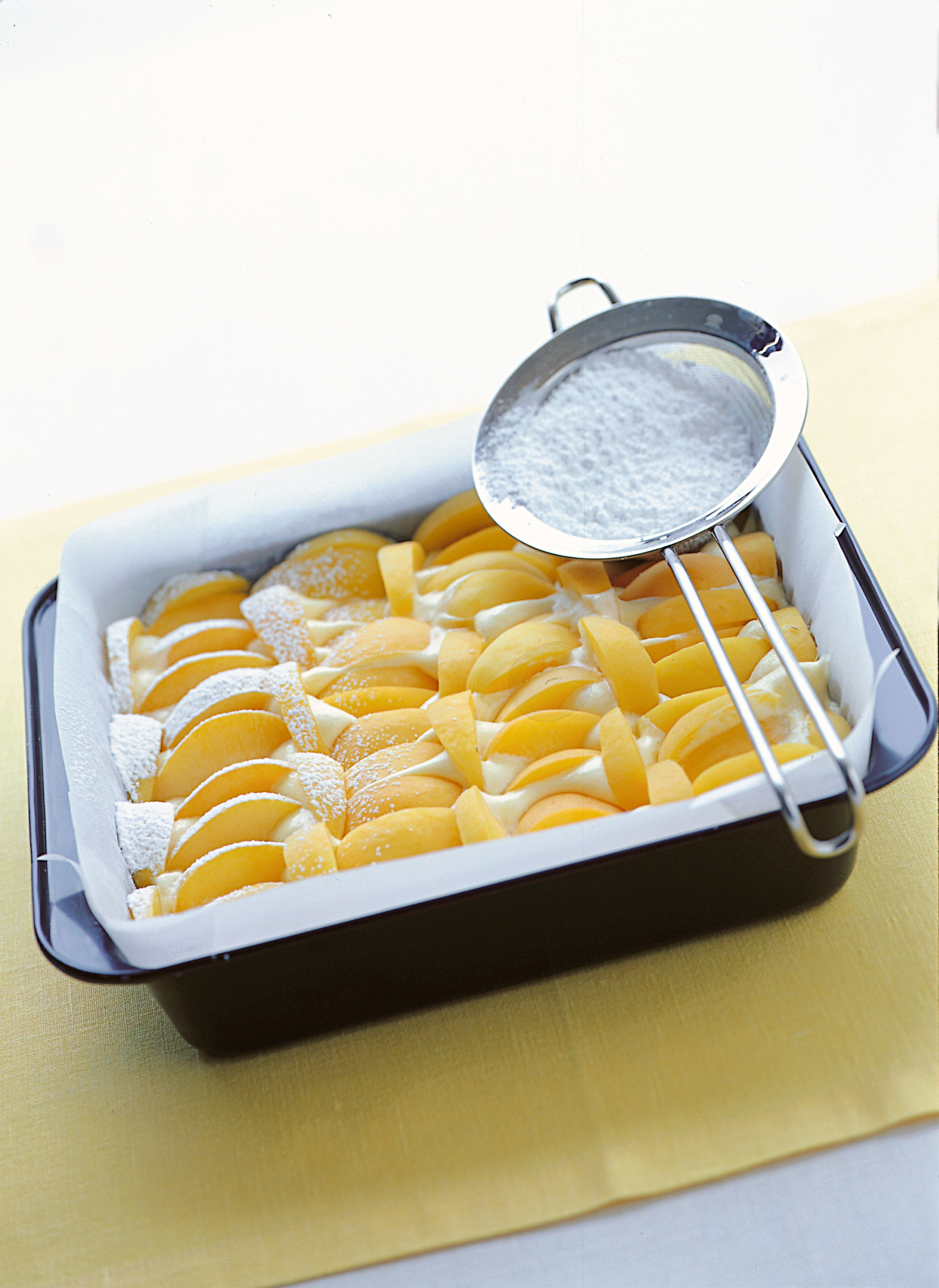 4) Completa. Togli la focaccia alle albicocche dal forno, lasciala raffreddare, sformala e cospargila di zucchero al velo appena prima di servire.