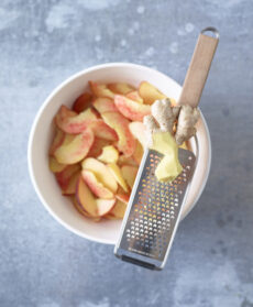 Mettete le mandorle a bagno in acqua. Lavate le pesche, asciugatele, tagliatele a metà, denocciolatele e riducetele a fettine di circa 3 mm di spessore. Trasferitele in una ciotola, aggiungete lo zenzero sbucciato e grattugiato, l'amido di mais e lo zucchero rimasto, mescolate e lasciate riposare per 10 minuti.