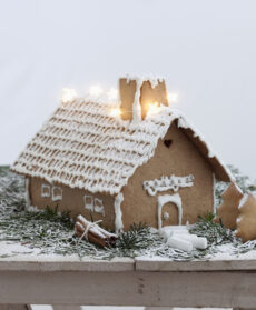 Per preparare la glassa, monta con una frusta elettrica lo zucchero a velo con gli albumi e 50 ml di acqua fredda. Preleva la glassa con una grossa siringa senza ago e decora la casetta come illustrato nella foto. Aggiungi dei dettagli con caramelline d'argento (per rifinire la porta), rametti di pino, stecche di cannella (come fascine di legna) e zucchero a velo (per la neve).