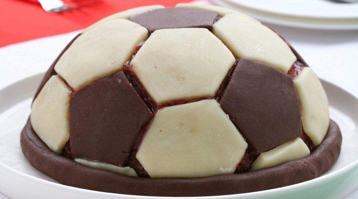 3  Spalmate la torta con 100 g di confettura di lamponi. Disponete un pentagono sulla sommità e procedete con gli altri pezzi, in modo da creare il disegno del pallone. Completate la base con un cordoncino di marzapane al cioccolato.