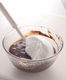 Lo stampo viene utilizzato tre volte: prima per cuocere il pan di Spagna, poi per congelare il cioccolato della farcitura, infine per montare il dessert. A ogni passaggio andrà pulito e foderato con nuova carta da forno bagnata e strizzata.