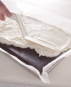 Tagliate il pan di Spagna a metà in orizzontale. Prelevate la lastra di cioccolato dal freezer, foderate lo stampo con nuova carta da forno e riempitelo a strati con metà pan di Spagna, metà crema al latte condensato, la lastra al cioccolato, la crema rimasta e il pan di Spagna restante. Sciogliete a fuoco minimo i due cioccolati e il burro rimasti e spalmate il composto sulla torta. Raffreddate per qualche ora.