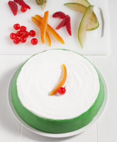 Con una spatola stendi la glassa sulla superficie della cassata e decora con spicchi di frutti canditi e ciliegine.