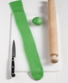 Sistema sul fondo della teglia un disco di pan di Spagna tagliato in misura; ricava dal secondo disco alcune strisce, sempre alte come i bordi della teglia, e falle aderire alla pasta reale.