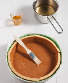 Prepara una bagna facendo sciogliere il restante zucchero con un bicchiere di acqua e mezzo bicchiere di rum in un pentolino a fuoco basso, poi spennella la base di pan di Spagna.