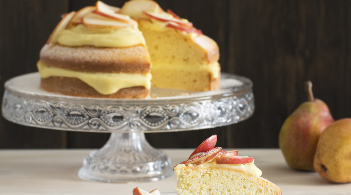 8) Farcite la torta con 2/3 della crema pasticcera, ricomponetela e spalmate la superficie con quella rimasta. Decorate con qualche fettina della pera rimanente e spolverizzate con poco zucchero a velo.