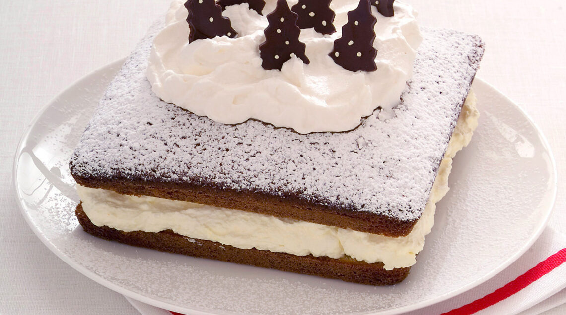 3) Monta la panna rimasta, disponila al centro del dolce e passate in frigo. Sciogli a bagnomaria il cioccolato con il burro, versalo su carta da forno e lascialo rapprendere. Ricava degli alberelli di Natale con uno stampino, decorali con i confettini e distribuiscili sulla torta.