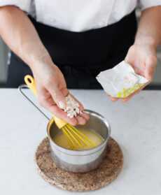 Fate fondere il burro in un pentolino (o nel microonde) senza superare i 37,5°; aggiungete 50 ml d'acqua e il lievito sbriciolato e mescolate bene fino a quando si sarà completamente sciolto.