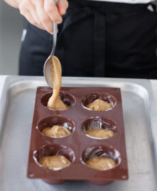 Trasferite l'impasto in 10 stampini da pandori monoporzione in silicone imburrati (oppure, in uno stampo grande classico, imburrato e infarinato; se invece usate stampini di carta, piccoli o grandi, non serve imburrare né infarinare).