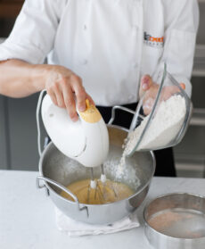 Trasferite nella ciotola dell'impastatrice il mix di burro e montate con le fruste; unite le uova, i tuorli, lo zucchero semolato e un pizzico di sale e sbattete per 10 minuti. Sempre continuando a sbattere, incorporate la farina setacciata poco alla volta. Lasciate lievitare coperto con un foglio di pellicola per 2 ore o finché non raddoppia il volume.