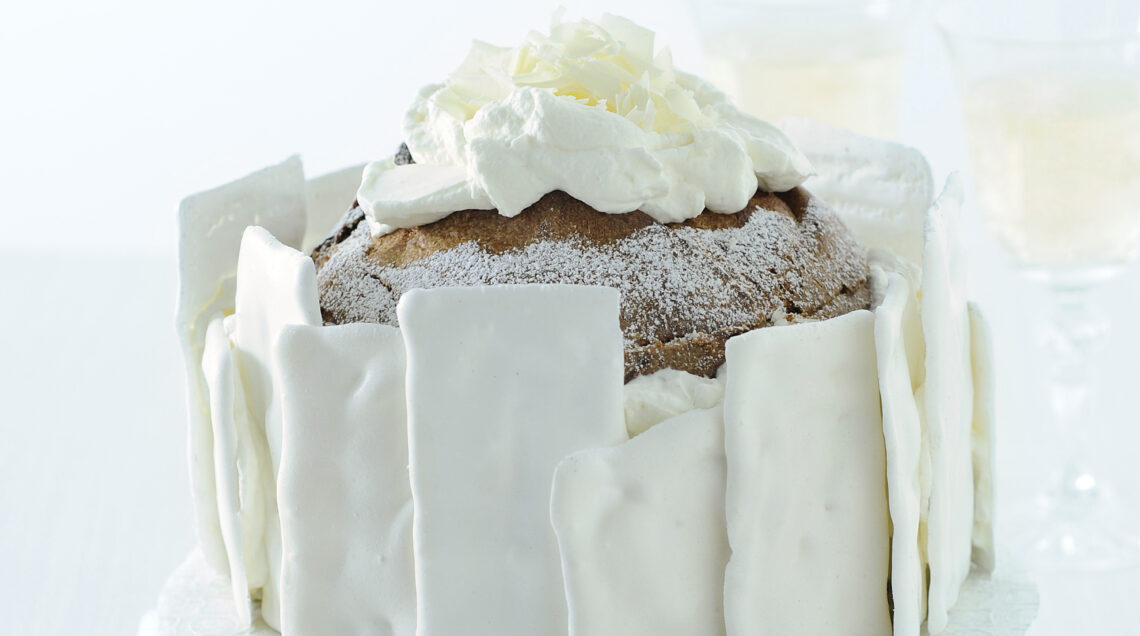Il panettone è il classico dolce natalizio nato a Milano ma diventato famoso in tutto il mondo. In questa ricetta è decorato con candide lamine di meringa. Un dolce speciale e inaspettato