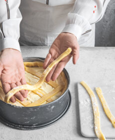 Con la pasta avanzata preparate tante strisce e disponetele incrociate sopra la crema. Ripiegate i bordi di pasta verso l'interno del dolce per formare un cordoncino. Infornate a 180° e cuocete per 1 ora. Fate raffreddare molto bene il dolce prima di servirlo.