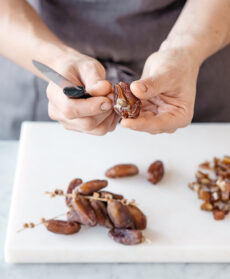 Incidete i datteri, tenendone da parte 6 interi, per il lato lungo ed eliminate il nocciolo, poi tagliateli a dadini. In una ciotola montate con la frusta elettrica le uova con lo zucchero di canna e un pizzico di sale.