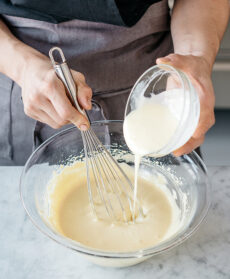 Quando il volume delle uova sarà raddoppiato, versate il latte al cardamomo raffreddato e incorporate il burro ammorbidito; mescolate bene, quindi unite le farine e la fecola setacciate con il lievito, i datteri tagliati a dadini e amalgamate il tutto delicatamente con una spatola, in modo da ottenere un composto ben omogeneo.