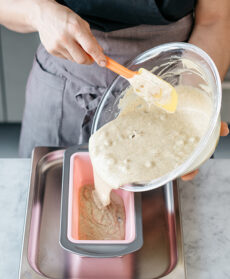 Versate il composto in uno stampo da plum cake in silicone di cm 19x9x5 e livellate bene la superficie con la spatola. Trasferite in forno già caldo a 175° per 25 minuti. A fine cottura, estraete il plum cake dallo stampo e mettetelo a raffreddare su una gratella.