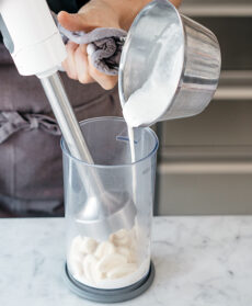 Intanto preparate la glassa al cioccolato: in un pentolino scaldate la panna con lo zucchero invertito (è reperibile nei negozi specializzati in prodotti per pasticceria, ma se non lo trovate potete sostituirlo con il miele); con la punta di un coltellino prelevate dal baccello i semini di vaniglia e stemperateli nella panna. Mettete nel bicchiere del frullatore a immersione il cioccolato bianco ammorbidito, versatevi la panna calda alla vaniglia e frullate, facendo attenzione a non immettere aria (senza andare su e giù con il frullatore e senza uscire dal composto). Riempite una tasca da pasticciere con la crema preparata, applicate una bocchetta rigata e trasferite in frigorifero per 20 minuti. Intanto posizionate il plum cake su un piatto da portata.