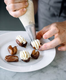 Tagliate per il lato lungo i datteri rimasti, estraete il nocciolo e farciteli con la glassa al cioccolato e vaniglia. Distribuite dei ciuffi di glassa anche sulla superficie del plum cake e posizionatevi sopra i datteri farciti.