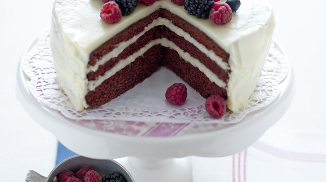 Una torta meravigliosamente aromatizzata e dalla nuance strepitosa grazie alla polpa di barbabietola. L'origine americana ne fa un dolce scenografico, con un frosting ottenuto mescolando formaggio cremoso, zucchero a velo e burro. L'impasto al cacao prevede l'uso del latticello e il profumi di vaniglia.