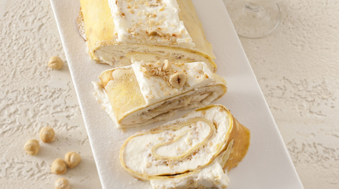 5) Riponete il rotolo di crèpe con le nocciole in frigo per una mezz'ora. Poi spalmatelo con la mousse tenuta da parte, cospargetelo con la granella rimasta e le nocciole tostate spezzettate e lasciatelo riposare in frigo per 4-5 ore prima di servirlo.
