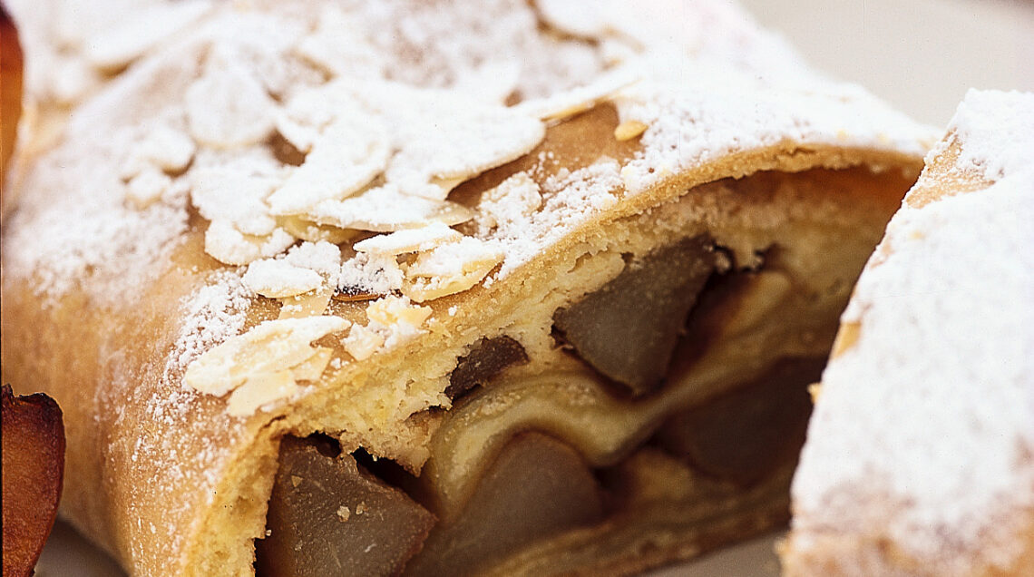 minuti. Trascorso questo tempo, sfornalo, spennella lo strudel con il burro rimasto fuso, cospargilo con le mandorle a lamelle tostate e lo zucchero a velo e lascialo intiepidire prima di servirlo tagliato a fette.