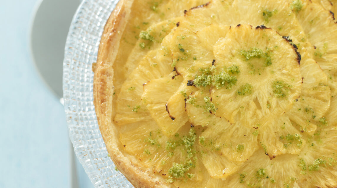 La tarte è una ricetta a base di pasta sfoglia e ananas molto leggera e golosa. Lo strato di sfoglia è completamente ricoperto dall’ananas tagliata a fette sottilissime, che dona alla torta un gusto delicatamente dolce e una grande leggerezza. Lo zucchero aromatizzato alla menta e alla salvia, poi, contribuisce a rendere il piatto estremamente fresco, perfetto per un buffet nelle giornate estive più afose.