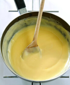 Montate i tuorli con lo zucchero semolato rimasto, unite la fecola e il succo di ananas e cuocete la crema su fiamma bassissima fino a che si addensa. Aggiungete la gelatina scolata e strizzata e mescolate fino a quando si è sciolta. Coprite la crema a contatto con la pellicola e fatela raffreddare.