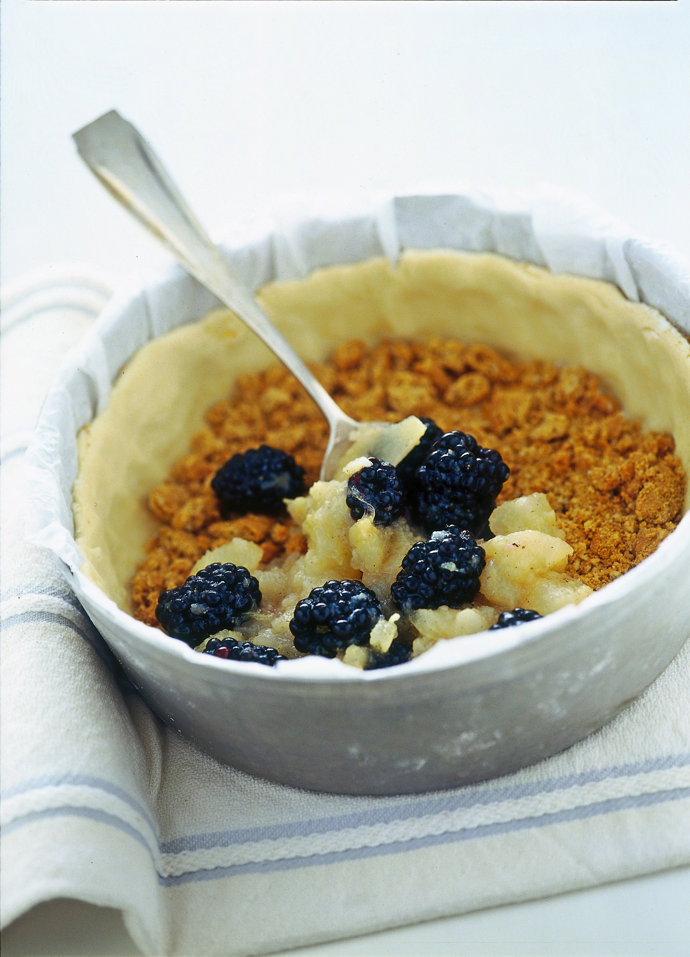 3) Trascorso il tempo del risposo, stendi i 2 pezzi di pasta in altrettanti dischi da 20 cm di diametro, disponine uno in uno stampo liscio e leggermente svasato di 18 cm, foderato con carta da forno. Cospargi il fondo con i biscotti tritati, riempilo con le pere e le more e posiziona il secondo disco a coprire. Sigilla i bordi, spennella la superficie con poco latte, cospargi con lo zucchero rimasto e cuoci la tarte nella parte bassa del forno a 200° per 40 minuti.