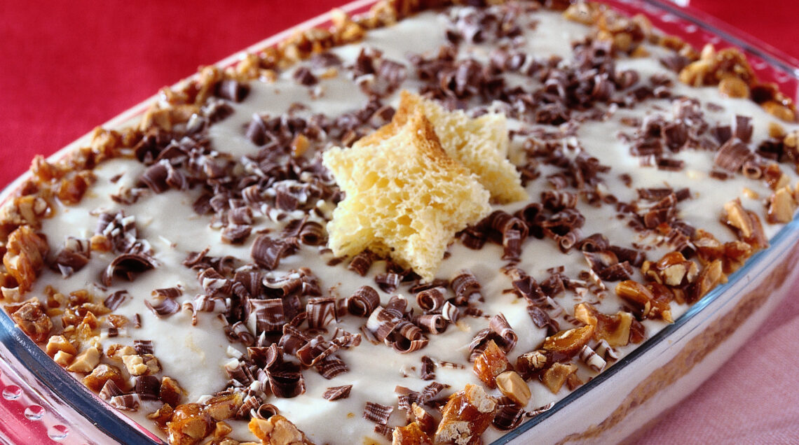 3 Spezzettate il croccante e distribuitelo lungo i bordi del tiramisù. Riducete il cioccolato a riccioli, o a scaglie, con un pelapatate e distribuiteli sulla superficie del dolce. Fate raffreddare il tiramisu in frigorifero per 2-3 ore. Servite il dolce guarnendolo, se vi piace, con alcune stelline ricavate dal pandoro.