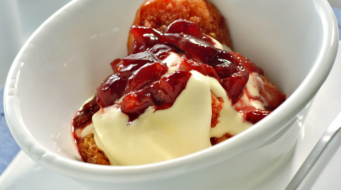 4) Immergi velocemente 12 savoiardi morbidi nello sciroppo di cottura delle ciliegie, strizzali leggermente fra le mani in modo da eliminare l'eccesso di liquido e distribuiscili in ciotole individuali alternandoli alla crema di mascarpone.