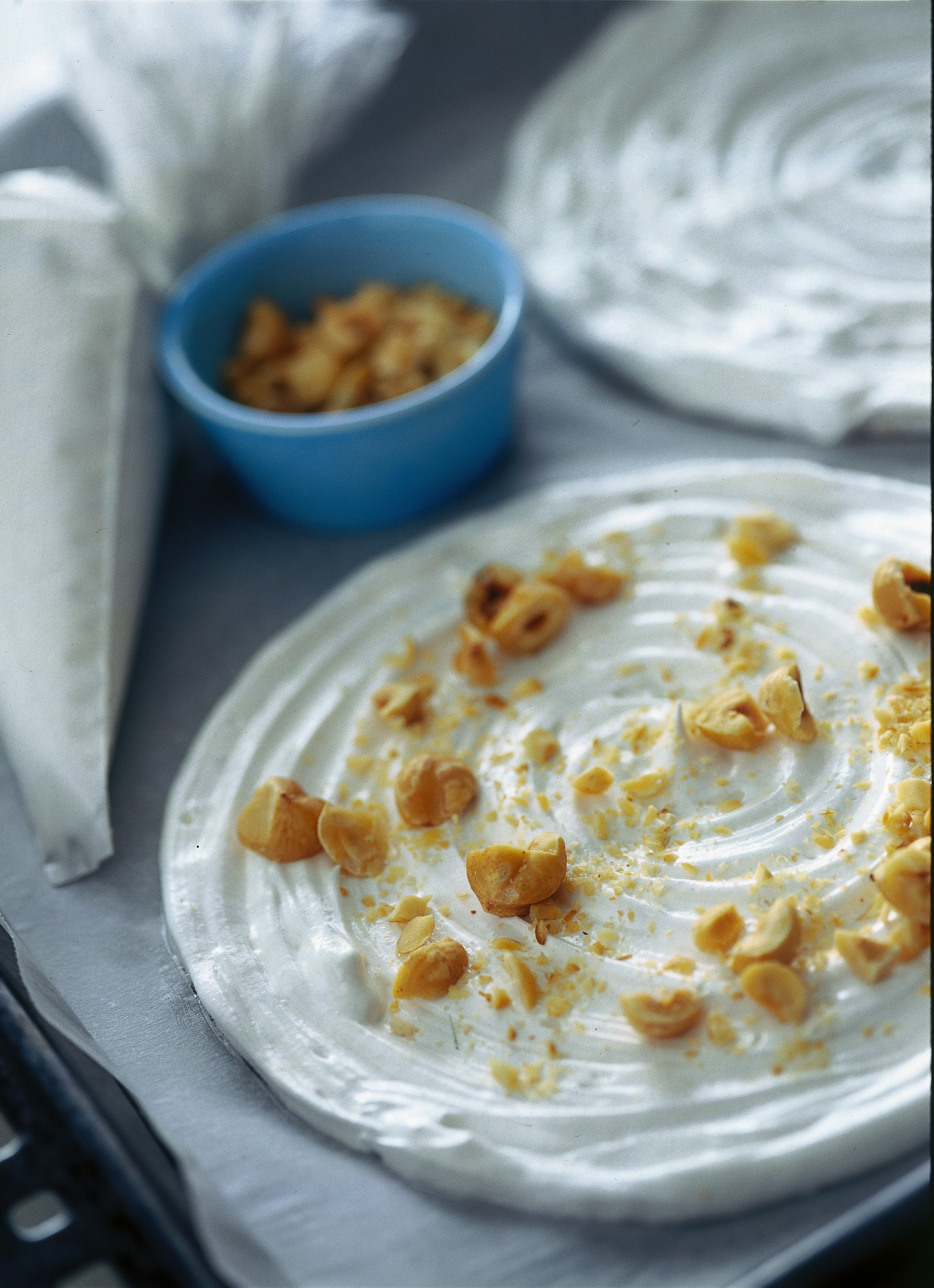 2) Su due fogli di carta da forno disegna con un pennarello da pasticceria o con un pennarello generico, avendo l'accortezza di rivoltare poi la carta, 4 cerchi del diametro di 18 cm. Aiutandoti con una sac à poche o tasca da pasticciere, spremi la meringa seguendo il cerchio disegnato, in modo da ottenere 4 dischi dello spessore di circa mezzo centimetro. Cospargi i dischi con le nocciole e cuocili nel forno caldo ventilato a 110° per circa 2 ore.