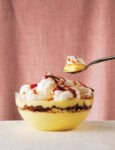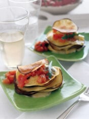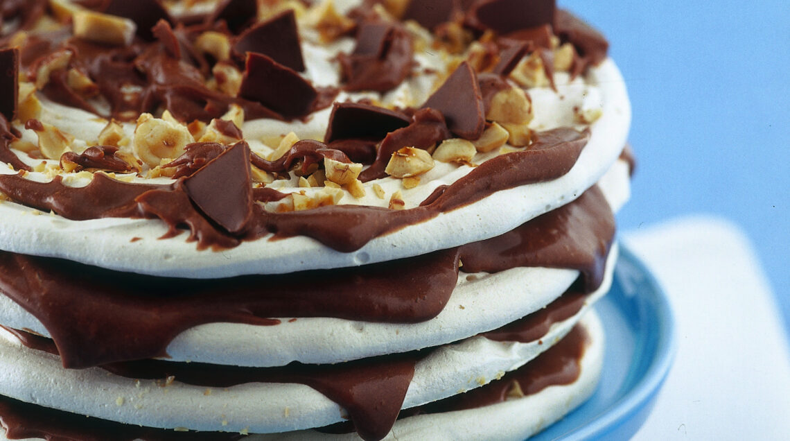 4) Trasferisci un disco di meringa sul piatto da portata, spalmalo delicatamente con la crema preparata, copri con un secondo disco, farcisci e ripeti con gli strati fino ad esaurire le meringhe. Decora la Torre di meringhe alla crema di nocciola, se ti piace, con lamelle di gianduiotto e nocciole tostate tritate.