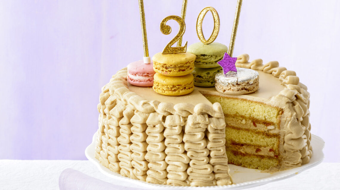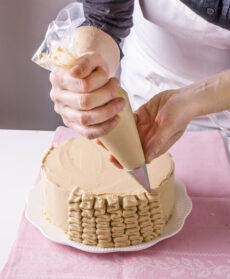 Farcite la torta con la crema al croccante, ricomponetela e, con una spatola, ricopritela con un sottile strato di crema. Mettete la crema rimasta in una tasca a bocchetta piatta e decorate i bordi della torta con tante serpentine. Conservate in frigo e decorate con macaron e candeline al momento di servire.