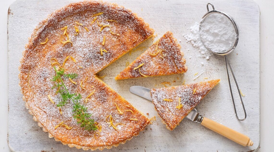 Ingredienti semplici, ma combinati fra loro in modo inaspettato: è il segreto di questa crostata farcita, dal profumo agrumato e aromatico, con spiccate note mediterranee