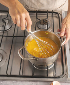 Cuocete la crema a fuoco dolcissimo sempre mescolando, finché si addenserà velando il cucchiaio. Fuori dal fuoco scioglietevi la gelatina strizzata mescolando. Lasciatela raffreddare e mettetela in frigo finché si sarà rappresa (almeno 1 ora).