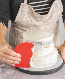 Realizzate la glassa. Montate la panna e mettetela in frigo. Montate il formaggio con lo zucchero a velo fino a ottenere una crema spumosa e poi incorporate la panna. Con una spatola spalmate il composto sulla pila di torte ricoprendola interamente. Decorate a piacere.
