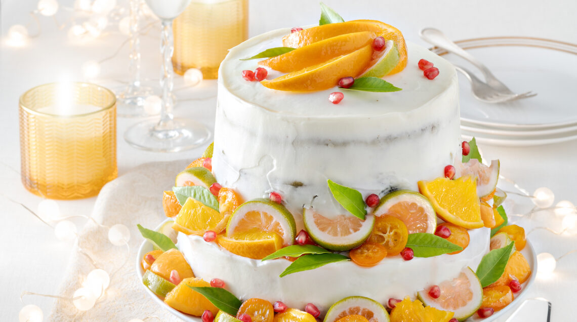 Un dolce complesso che sfrutta il sapore e l'aroma degli agrumi e della miscela di tè agrumato e speziato. Una torta a due piani, rifinita con una glassa insolita preparata con panna e formaggio fresco spalmabile. I colori degli agrumi e della melagrana a guarnizione esaltano il colore candido del dolce, rendendolo perfetto anche per ricorrenze speciali, come per esempio un compleanno.