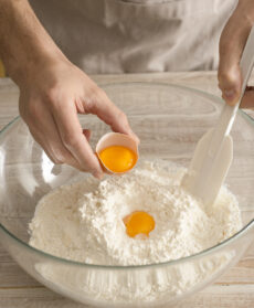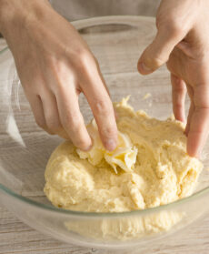 Unite il burro morbido a fiocchetti, lavorando il composto con le mani, poi continuate a impastare sulla spianatoia per circa 10 minuti.