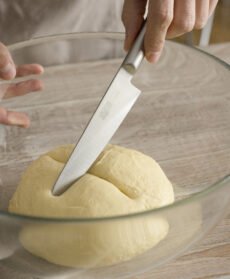 Formate una palla, incidetela con un taglio a croce, trasferitela nella terrina, copritela con un foglio di pellicola e lasciatela lievitare per 2 ore in luogo tiepido.