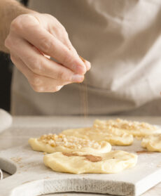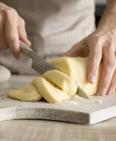 Con un coltello tagliate il rotolo a fette di circa 1 cm di spessore, poi stendetele in piccole sfoglie di circa 1/2 cm di spessore.