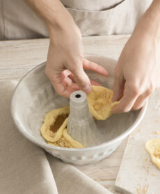 Riempite uno stampo da kuglof di 20 cm di diametro, imburrato e infarinato, alternando i 2 tipi di sfoglie. Coprite lo stampo e lasciate lievitare per un'altra ora in luogo tiepido. Cuocete il dolce in forno preriscaldato a 180° per circa 40 minuti. Sformatelo e lasciatelo raffreddare su una gratella.