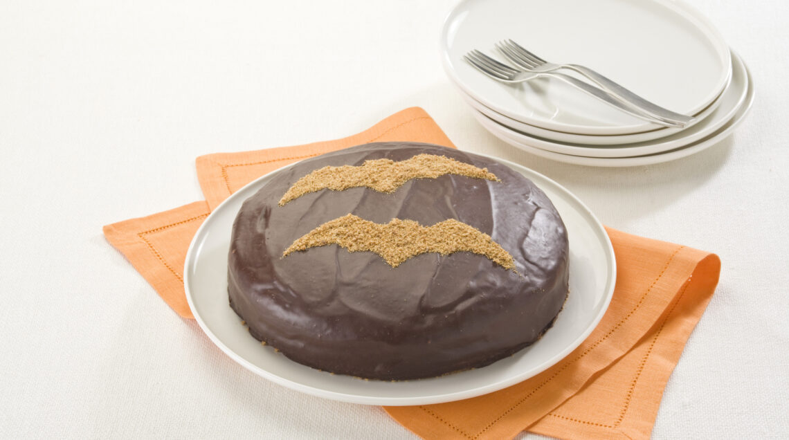 4) Disegna su un cartoncino in misura della torta 2 sagome a pipistrello e ritagliale. Quando la glassa della torta si sarà completamente raffreddata, posavi le sagome, spennella l'interno con poca gelatina di albicocche e cospargi con gli amaretti frullati al mixer. Togli delicatamenete il cartoncino e servi la torta da brivido al cioccolato.