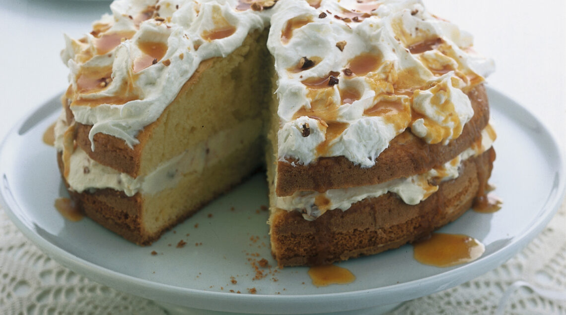4) Monta la panna rimasta, spalmala sul dolce e versa su di esso il caramello ormai freddo. Gusta subito la torta caramellata con crema al croccante.