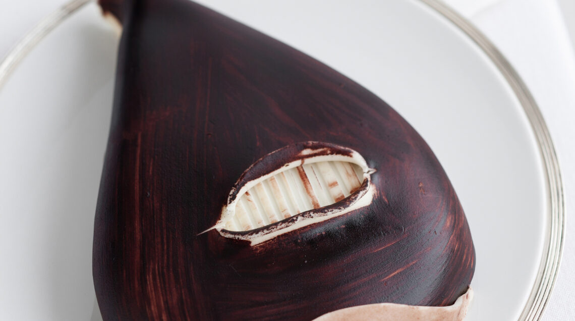 7) Sciogli 2-3 cucchiai di cacao in poca acqua. Ricava da un pezzetto di pasta di mandorle un piccolo ovale, spennellalo qua e là con il cacao sciolto e appoggialo al centro della torta.