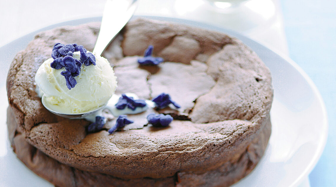 4 Sformate la torta, punzecchiatela con uno stecchino di legno e versatevi sopra il rum. Sistematela sul piatto di portata, decoratela con violette candite e servitela con una pallina di gelato di crema.