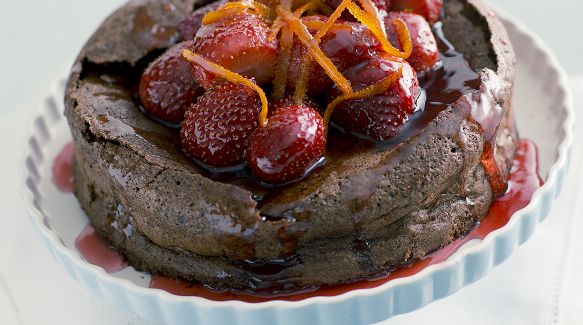 1) Lava le fragole, asciugale e tagliale. Poi rivesti uno stampo a cerniera di 18 cm di diametro con carta da forno. Separa i tuorli dagli albumi. Trita finemente il cioccolato e fallo sciogliere a bagnomaria con il burro ridotto a dadini.