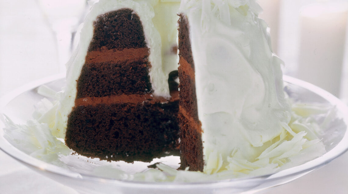 3) Taglia la torta in 3 strati; monta la crema scura finché risulterà chiara e spumosa e spalmala subito su 2 strati della torta, ricomponendola. Monta la crema bianca e spalmala su tutta la torta. Guarniscila con riccioli ottenuti dal cioccolato bianco rimasto e tienila in frigo per 2 ore.